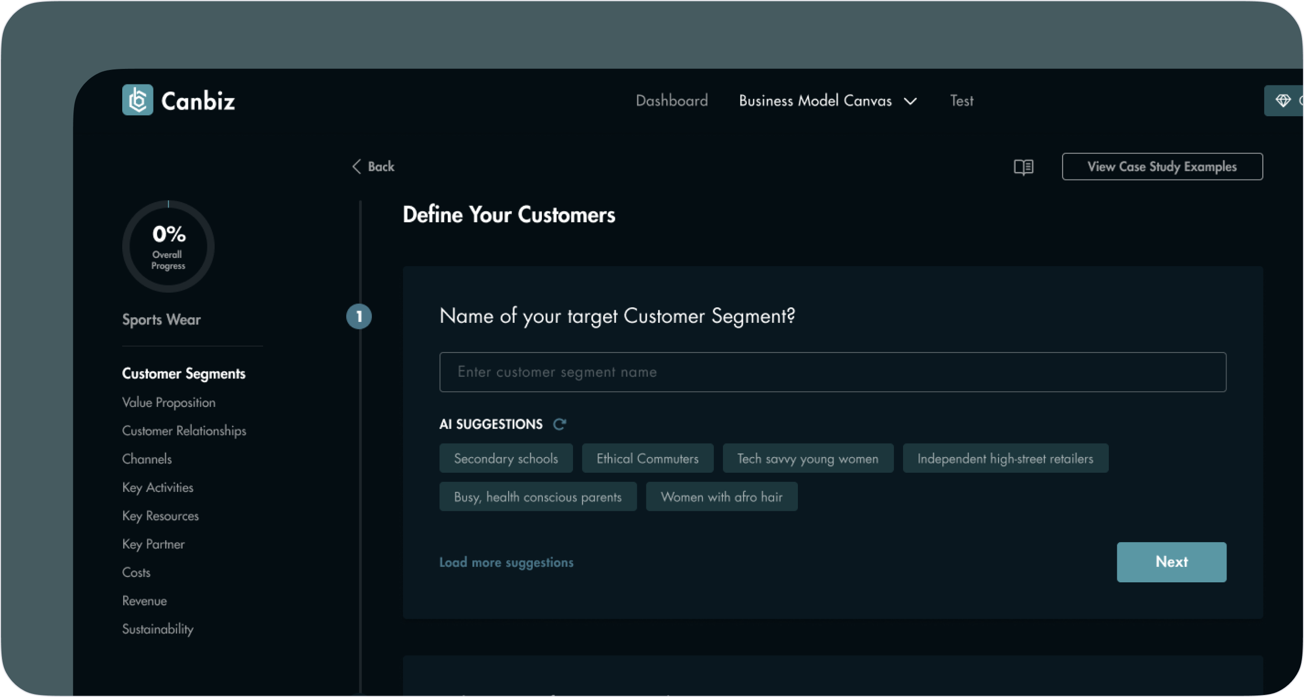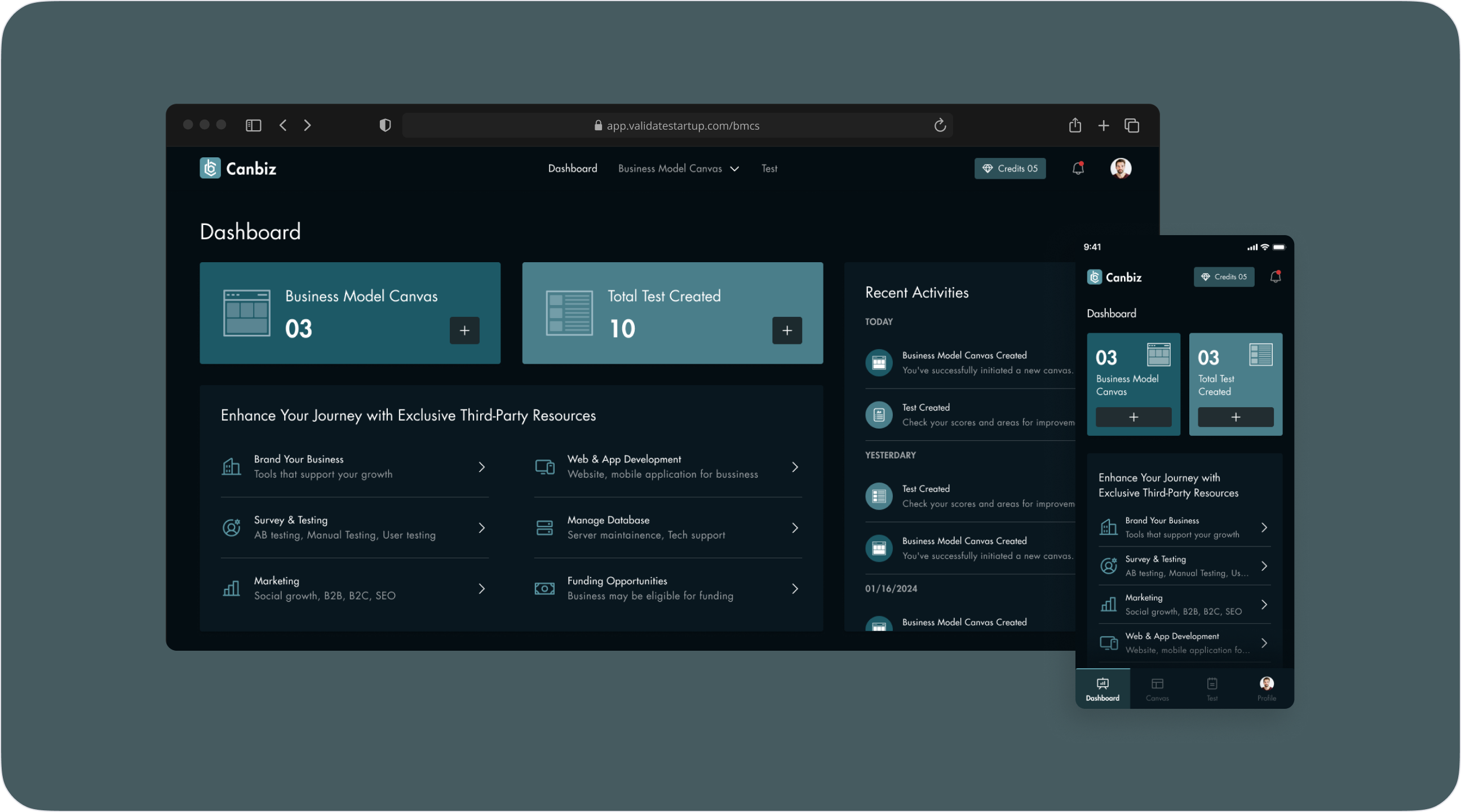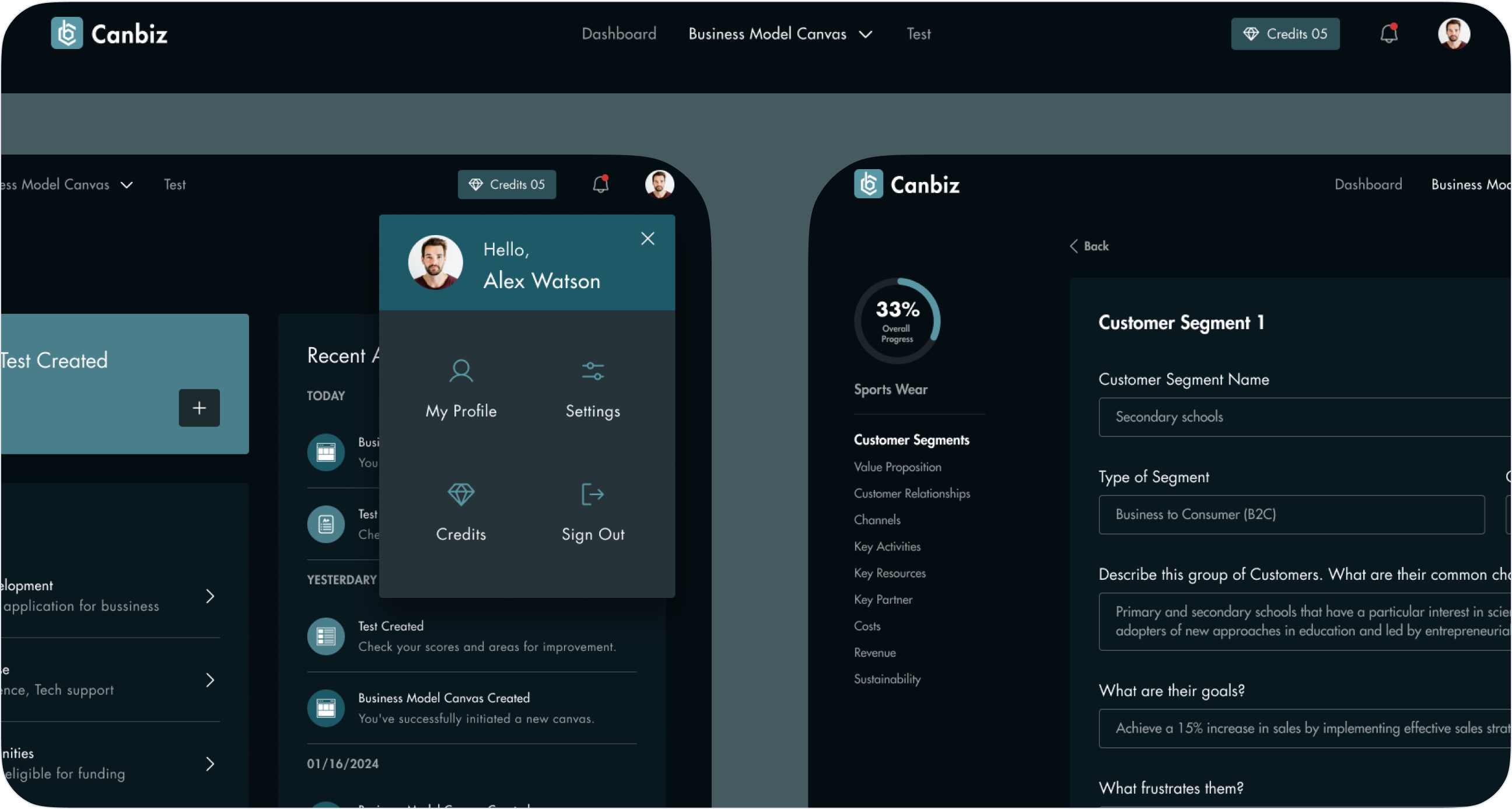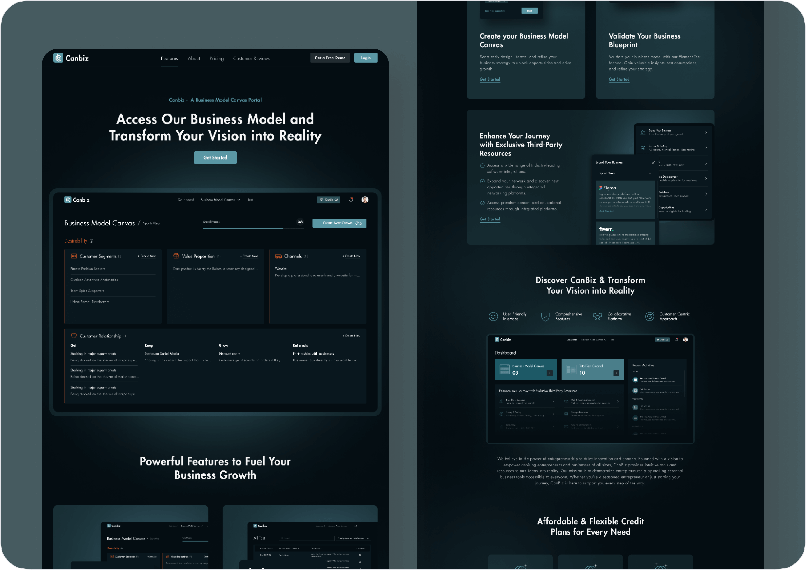 Design a new logo for Canbiz, create a user-friendly, mobile-optimized interface with a sleek dark theme, and implement a clear onboarding process to guide users through the BMC framework. AI will provide personalized insights, and educational resources like tutorials and case studies will enhance user support, with potential partnerships for added resources and community access also considered.