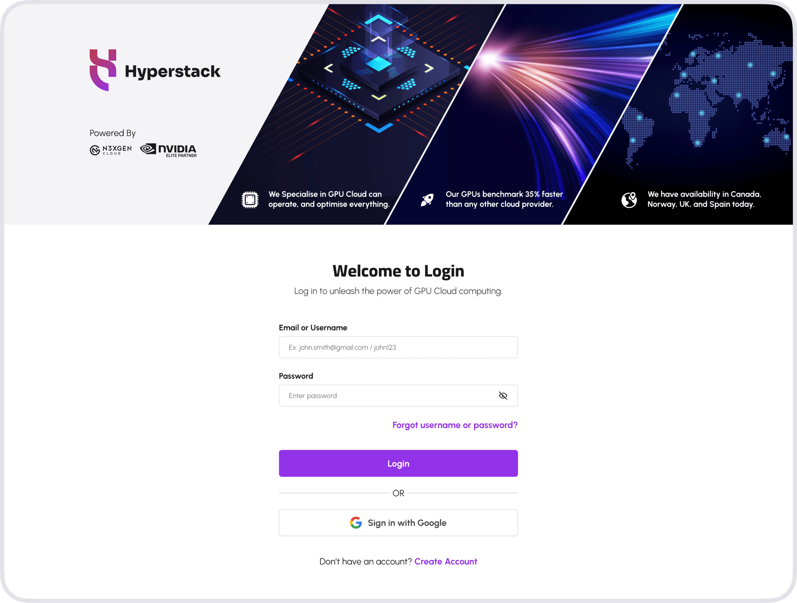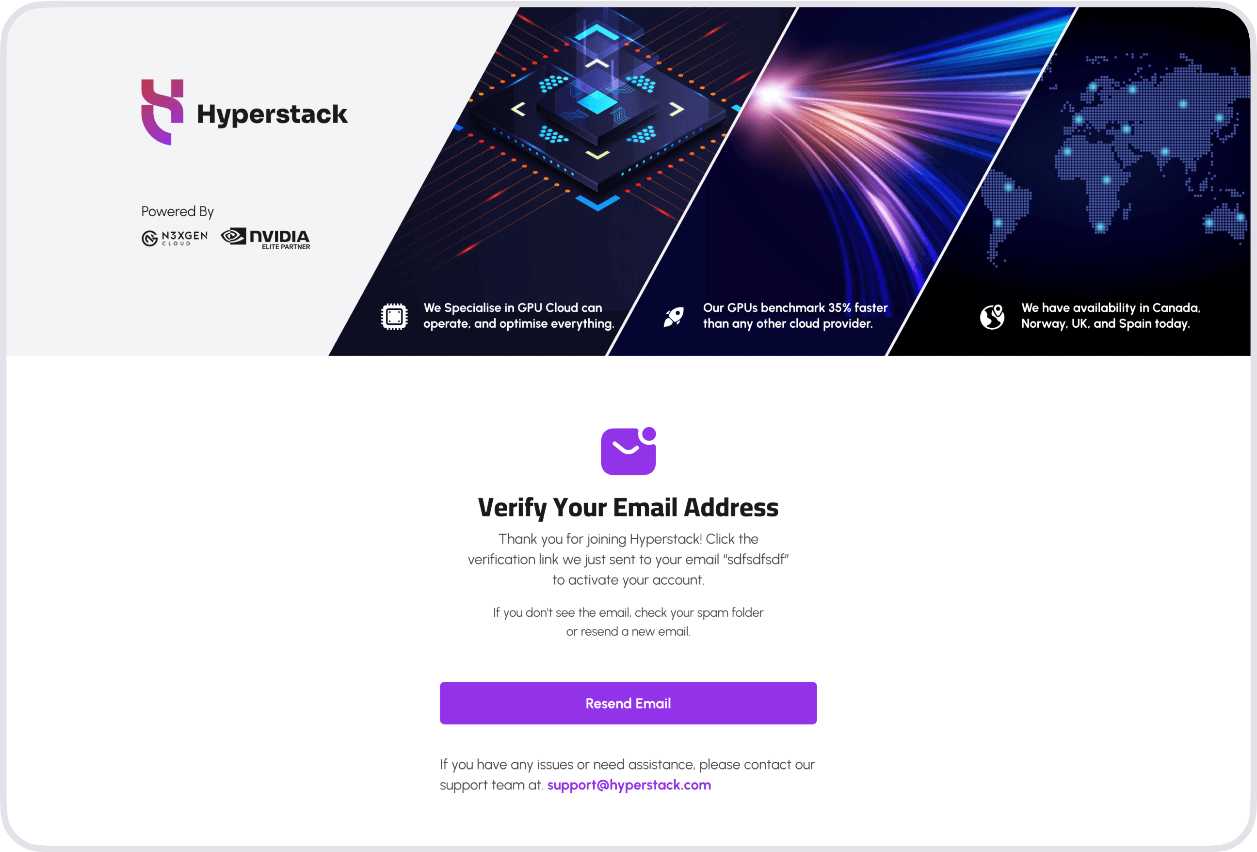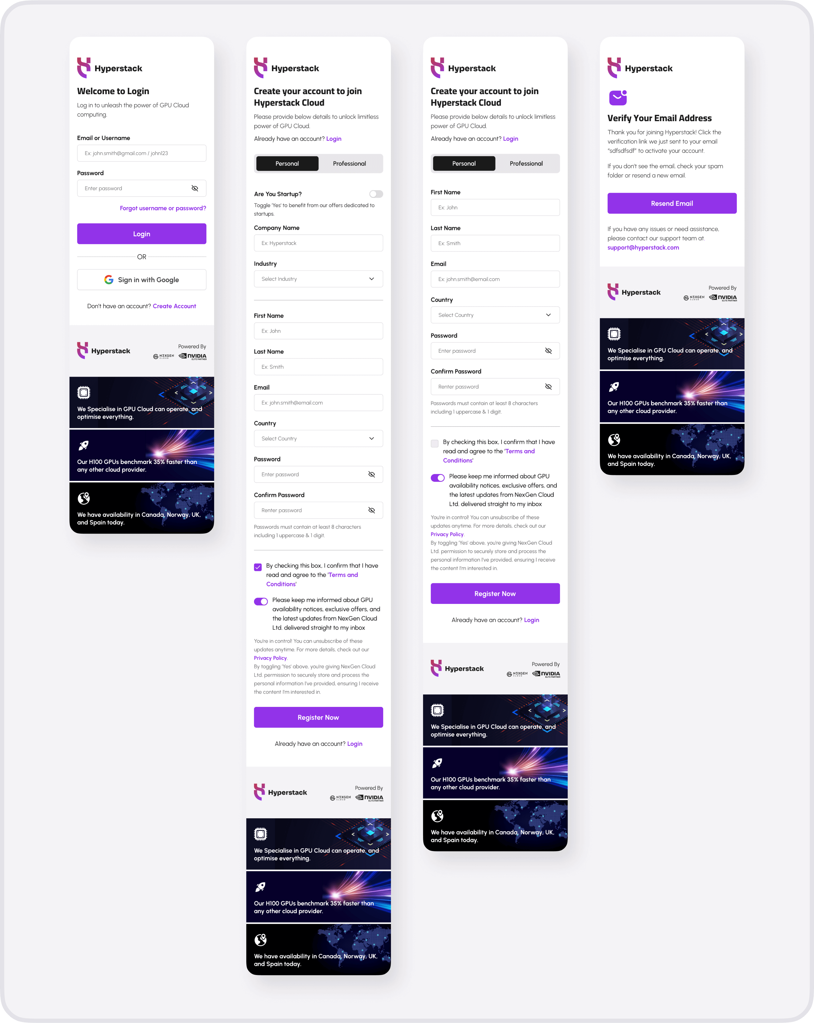 The client required a redesign of their registration flow, including the signup, email verification, and login pages. While Hyperstack had an existing color style guide, the login and signup pages were allowed more design flexibility, provided the logo and primary colors were loosely followed.