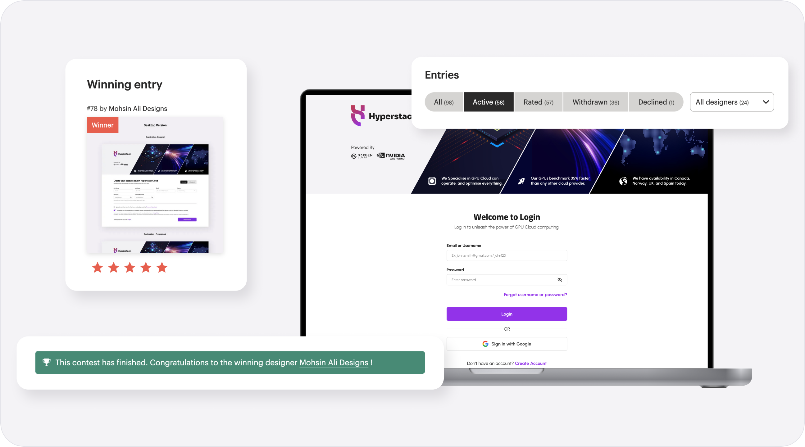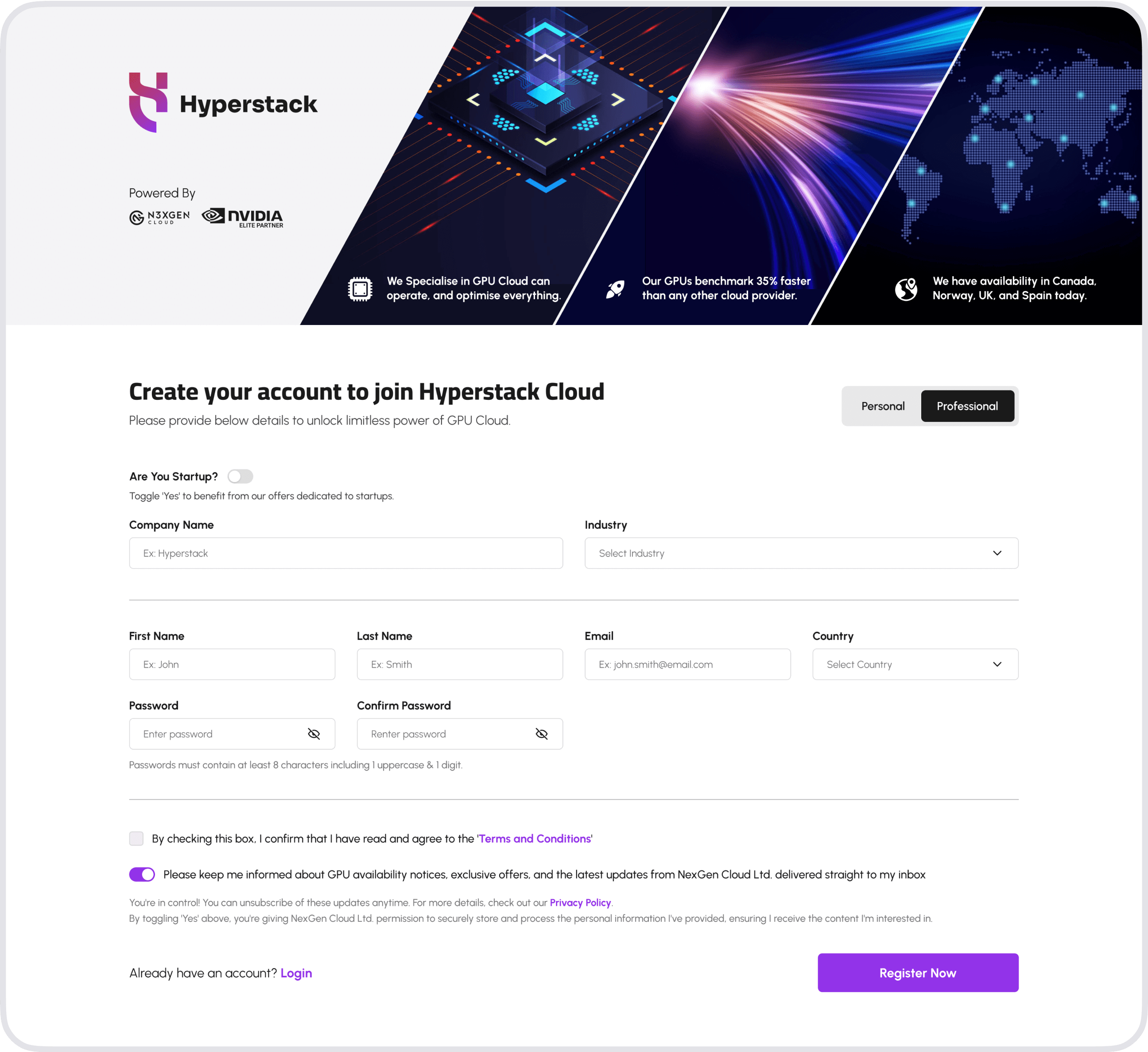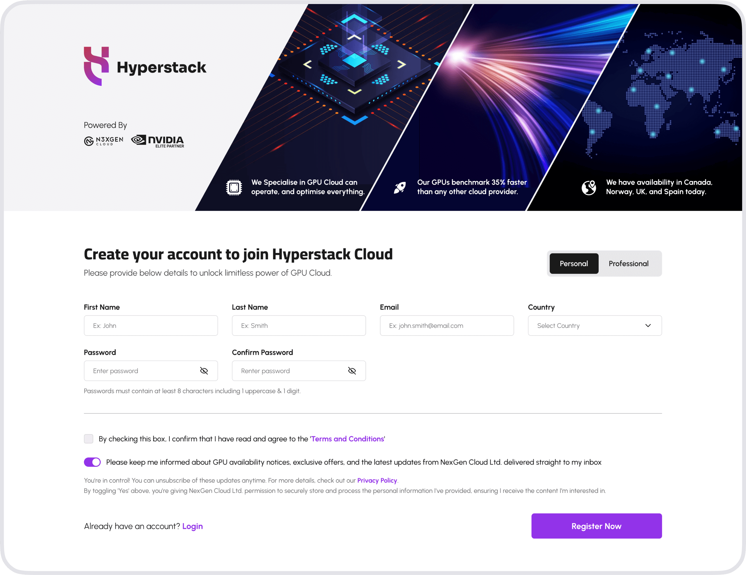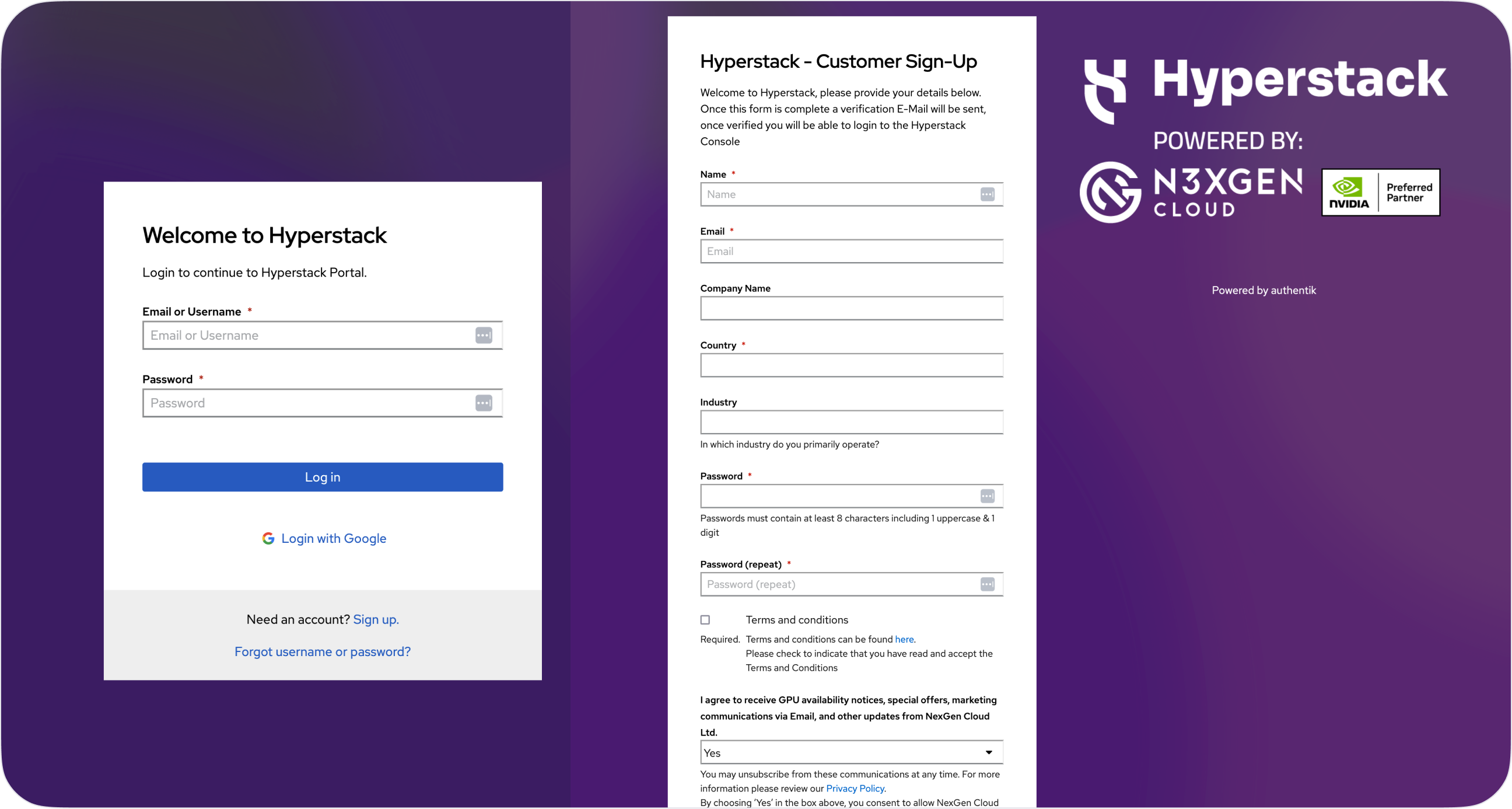 The client required a redesign of their registration flow, including the signup, email verification, and login pages. While Hyperstack had an existing color style guide, the login and signup pages were allowed more design flexibility, provided the logo and primary colors were loosely followed.
